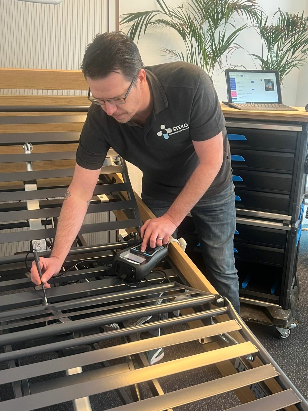 De keurmeesters en monteurs van STEKO Hulpmiddelen Service vormen de technische ruggengraat van onze dienstverlening. Met specialistische kennis en jarenlange praktijkervaring zorgen zij ervoor dat zorghulpmiddelen veilig, betrouwbaar en volgens de geldende normen functioneren.